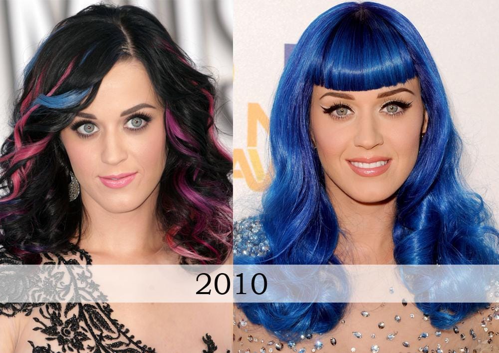 Di tahun 2010, Katy Perry menghadiri dua perhelatan besar dengan gaya rambut yang sangat berbeda. Di acara MTV Video Music Awards yang berkesan fun, Katy mengekspresikannya dengan highlight rambut berwarna-warni. Sedangkan di MTV Movie Award, cewek bernama asli Katheryn ini tampil di red carpet dengan menggunakan wig berwarna biru.