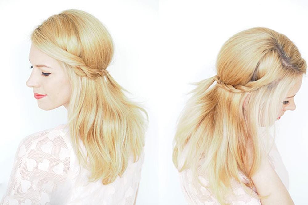 4. Kemudian kedua sisi rambut tersebut kamu tarik ke belakang seperti membentuk mahkota, satukan dan ikat kedua rambutnya dengan karet rambut.