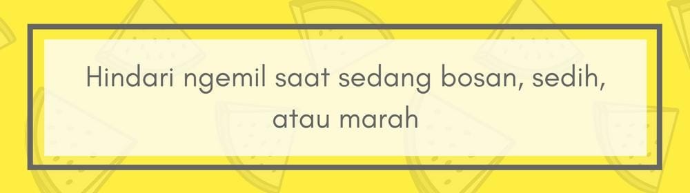 Mengonsumsi makanan saat kondisi emosi kita sedang nggak baik memang terbukti membantu mengembalikan mood. Tapi, ini bukanlah solusi Bela. Motivasi dirimu sendiri untuk menghindari camilan saat emosimu sedang naik turun. Coboalh untuk menenangkan diri sebentar sambil minum air mineral.