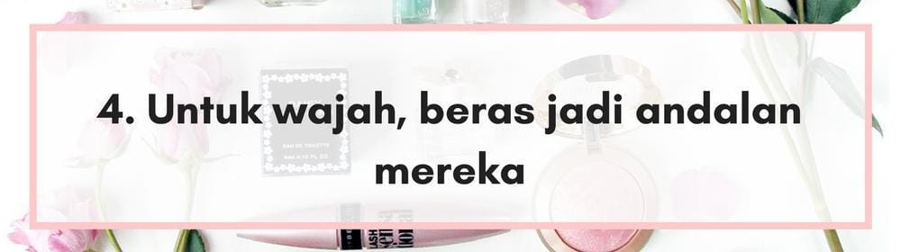 Perempuan Jepang juga gemar memanfaatkan tepung beras yang dicampur dengan bahan-bahan tertentu, untuk menutrisi kulit mereka. Beras diyakini bisa memberikan gizi pada kulti wajah, sehingga terbebas dari flek hitam dan juga kerutan.