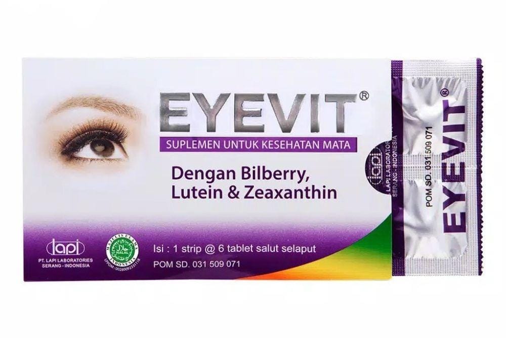 Eyevit merupakan merek vitamin mata yang memiliki berbagai kandungan baik seperti pure bilberyy, lutein, zeaxanthin, retinol dan vitamin A. Semua kandungan tersebut berfungsi untuk menjaga kesehatan mata. Selain itu, produk ini juga dapat mencegah mata minus, mengatasi mata lelah, serta melindungi mata dari sinar biru pada gadget. Tenang, Eyevit aman dikonsumsi mulai dari anak-anak, ibu hamil, hingga ibu menyusui.