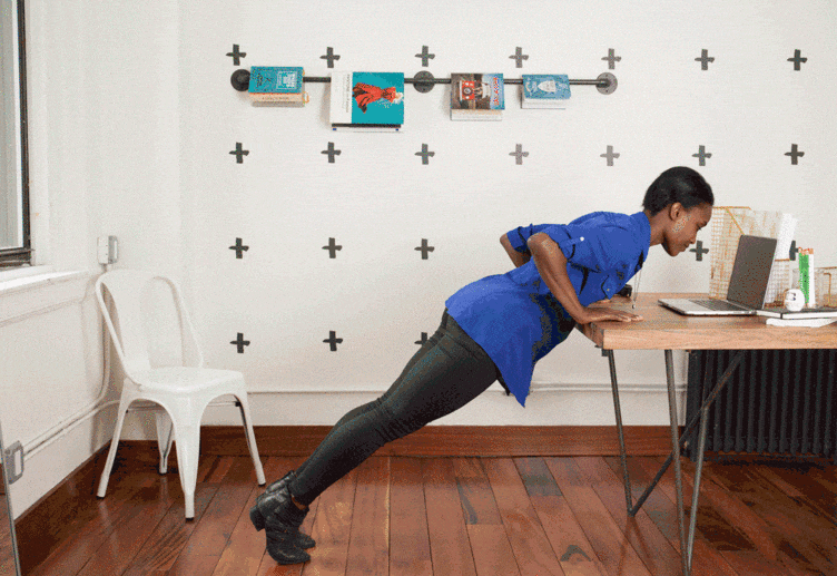 Berdiri beberapa langkah di depan mejamu dan letakkan telapak tanganmu di tepi meja. Beri jarak selebar bahu seperti jika kamu hendak melakukan push up biasa. Bawa dadamu turun ke dekat sisi meja seperti melakukan push up. Kamu bisa mengulangi gerakan ini sebanyak 10-20 kali.
