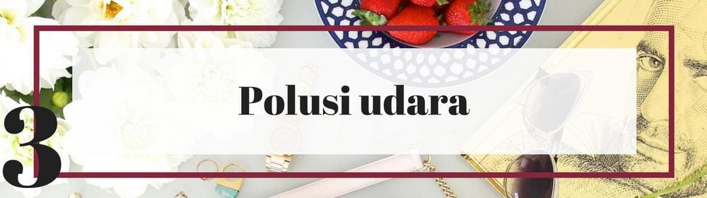 Yang satu ini amat sering ditemui saat kita beraktivitas sehari-hari. Polusi udara yang mayoritas berasal dari kendaraan ternyata memiliki resiko yang cukup fatal lho, untuk diri kita. Pori-pori dan folikel rambut dapat tersumbat, yang berujung pada kulit kusam, kering, dan tentunya berjerawat. Apabila terus terjadi, lama-kelamaan kulit pun terancam kehilangan elastisitasnya.
