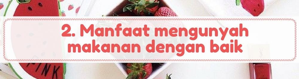 Mulut dan gigi merupakan organ awal dalam sistem pencernaan tubuh kita Proses mengunyah makanan oleh gigi di dalam rongga mulut bukan hanya bertujuan untuk melumatkan makanan agar mudah melewati kerongkongan,lho. Akan tetapi, dengan mengunyah makanan secara benar, maka nutrisi yang terdapat dalam makanan akan terserap dengan sempurna di dalam tubuh. Oleh karena itu, dokter gigi sering menyarankan kita untuk mengunyah makanan sebanyak 32 kali. Bahkan salah satu penyebab munculnya karang gigi adalah karena gigi jarang digunakan untuk mengunyah makanan.
