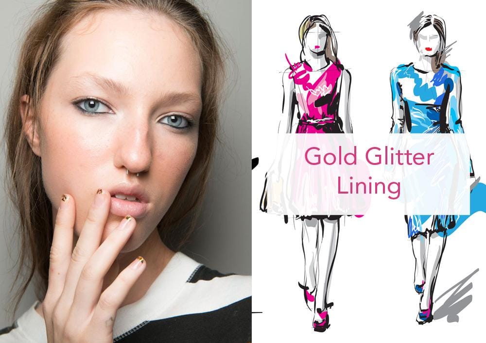 Kamu juga bisa mengkreasikan french manicure dengan pulasan cat kuku berwarna emas dan bertekstur gliter seperti di pertunjukkan House of Holland.