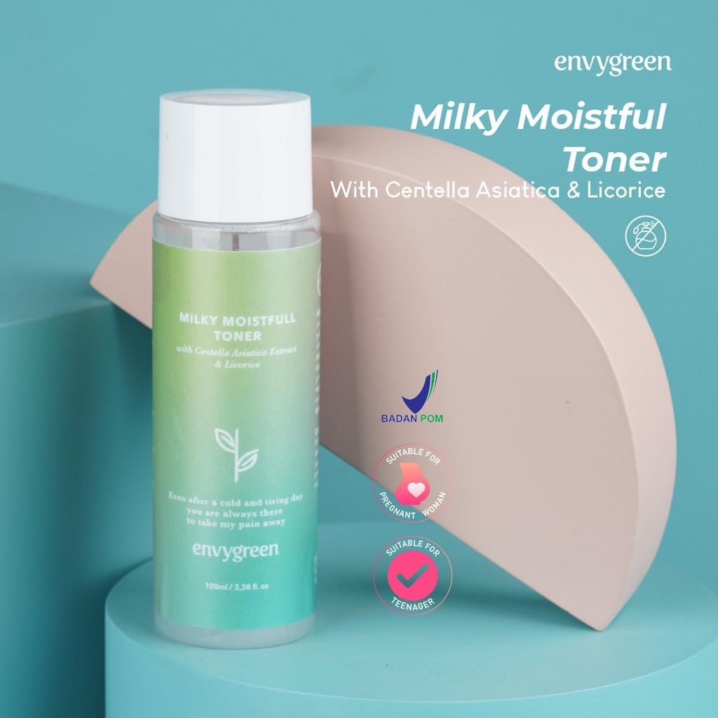 Envygreen Milky Moistfull Toner merupakan toner yang diklaim dapat menyeimbangkan level pH di kulit dan mengembalikan kadar kelembapan wajah setelah mencuci muka. Kandungan niacinamide pada toner ini diklaim efektif mengontrol sebum, mencerahkan kulit, meredakan inflamasi dan kemerahan, serta mendukung skin barrier.