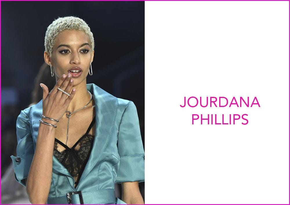 Jourdana memadukan rambut pendeknya yang berwarna pirang platinum dengan pulasan perona mata bertekstur shimmer yang lembut dan pulasan lipstik bernuansa netral.