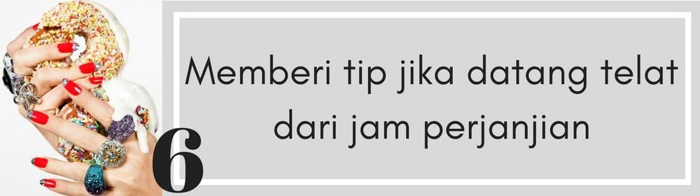 Kalau memberi tip atas keterlambatan kedatangan membuatmu merasa lebih baik, silakan memberinya. Namun yang lebih disarankan adalah menelepon untuk mengabarkan keterlambatanmu sehingga salon dapat memberikan akomodasi terbaik untukmu dan klien lain.