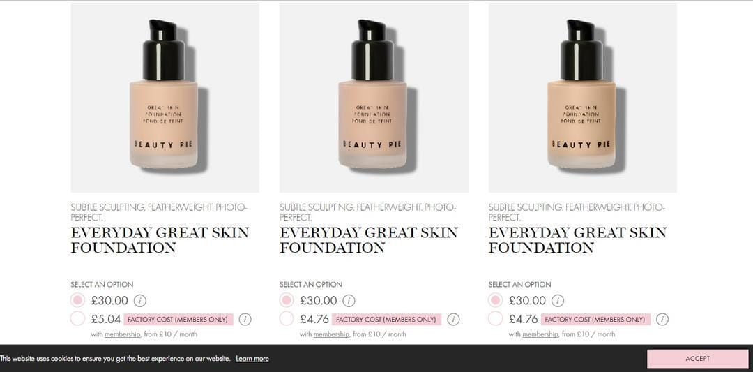 Konsepnya sangat sederhana, jika kamu mendaftar dengan harga USD 10 atau IDR 133 ribuan per bulan, kamu bisa mendapatkan semua produk kosmetik dengan harga murah (dari pabrik). Misalnya, maskara Beauty Pie memiliki harga USD 24 atau sekitar IDR 321 ribu, namun jika kamu mendaftar sebagai anggota maka kamu hanya akan dikenakan biaya maskara sekitar USD 2 atau IDR 26 ribu saja.