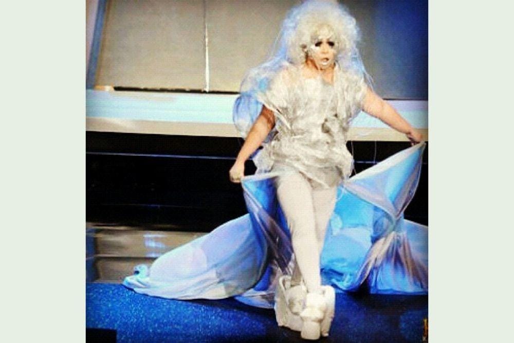 9. Bulu mata palsu warni-warni dan alis biru yang nyentrik, rasanya cuma Melly Goeslaw yang bisa tampil keren dengan riasan seperti ini.