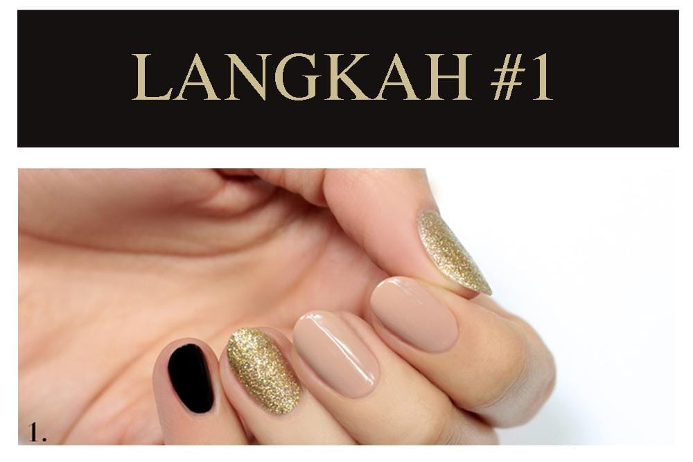 Langkah pertama, bersihkan seluruh kuku kamu terlebih dahulu, kemudian aplikasikan cat kuku dengan warna hitam, gold glitter, dan nude. Kamu bisa variasikan ke 5 jarimu.