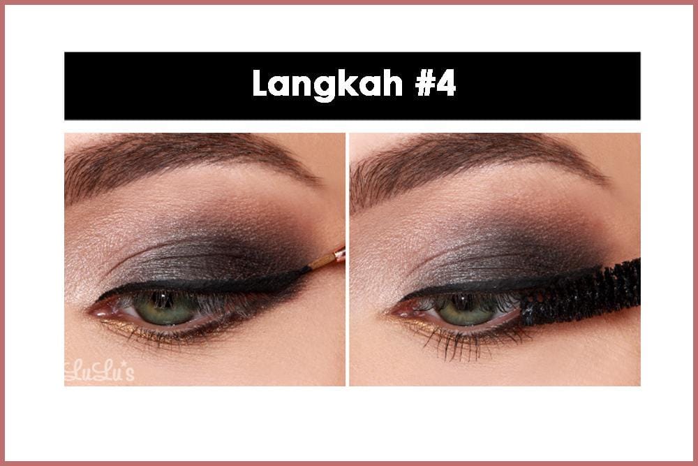 Kemudian dengan eyeliner hitam buat eyeliner bentuk cateye. Pulaskan sedikit maskara sebagai finisihing touch.