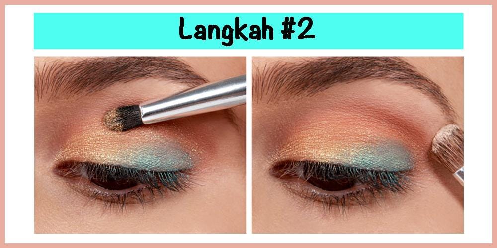 Pertama, pilih warna basic seperti warna matte nude colored eyeshadow, ini hanya untuk memberikan definsi saja di matamu. Lalu aplikasikan di kelopak kamu sampai bagian luarnya. Setelah itu pilih shimmery dengan warna turquoise eyeshadow, lalu aplikasikan hanya di bagian luar kelopak mata kamu ya.