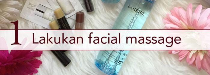 Facial massage ini berfungsi untuk memperlancar peredaran darah di wajah. Spot yang wajib untuk kamu beri massage adalah area bawah mata, untuk mengurangi kantung mata. Lakukan facial massage dari area dalam menuju ke luar.