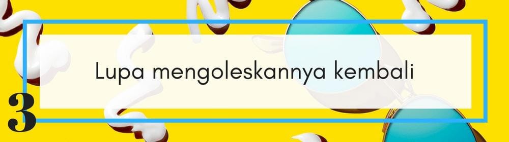 Karena sudah mengoleskannya sebelum pergi, kamu merasa kulit sudah terlindungi sempurna. Padahal, menggunakan tabir surya harus dilakukan secara berkala tergantung pada jumlah SPF yang terkandung didalamnya. Meskipun memiliki label water resistant, kamu tetap harus mengoleskannya setidaknya 80 menit sekali untuk melindungi kulit dari paparan sinar matahari.