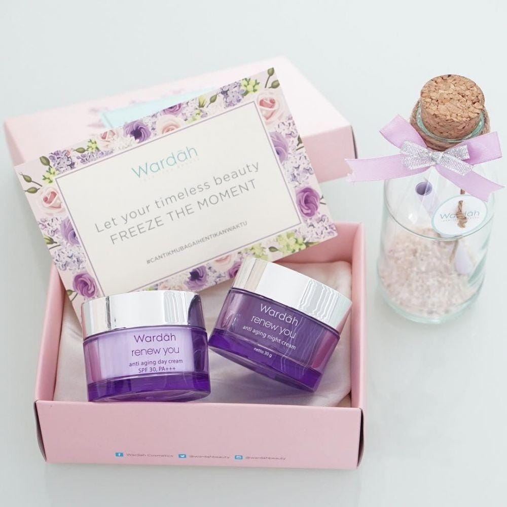 Wardah Renew You Anti Aging Night Cream ini mampu merangsang kulit untuk beregenerasi. Selain itu, produk ini mampu melembapkan kulit dan memperbaiki tekstur kulit wajah. Krim ini tersedia dalam dua ukuran dan keduanya punya kemasan berbeda. Ukuran besarnya memiliki kemasan jar keunguan dengan tutup aluminium, sementara kemasan kecil memiliki kemasan berupa tube warna ungu.