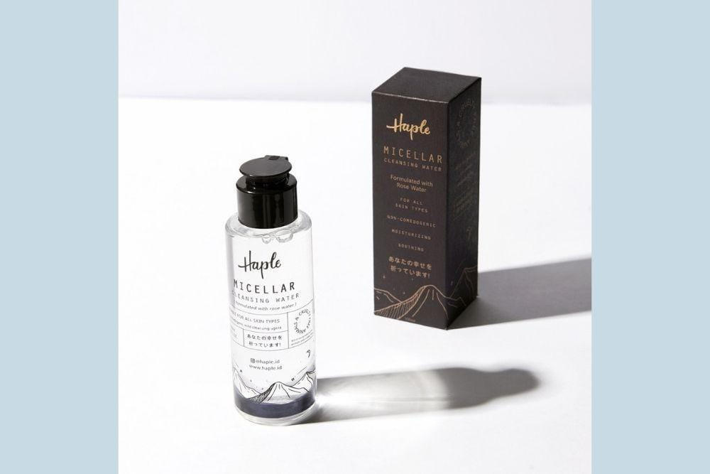 Sebelum mencuci wajah, sebaiknya angkat makeup dan kotoran terlebih dahulu menggunakan micellar water. Salah satu produk lokal yang aman untuk kulit berminyak adalah Haple Micellar Water.