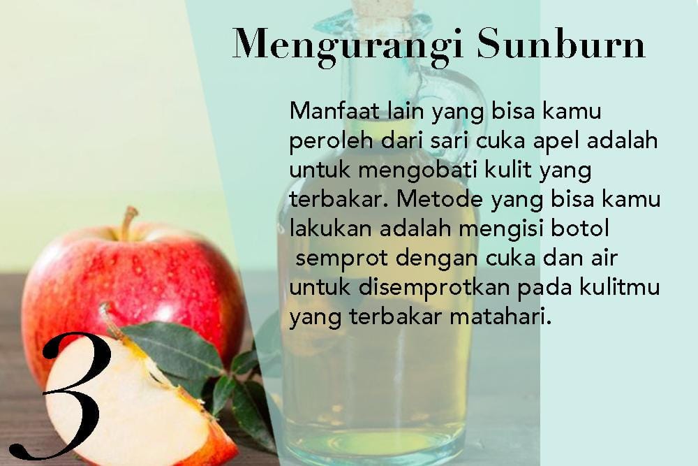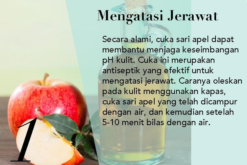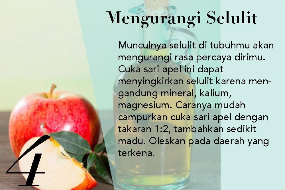 Apa yang kamu ketahui tentang cuka sari apel untuk kecantikan kulit? Cuka sari apel merupakan salah satu bahan yang sangat bagus untuk mengatasi berbagai masalah kulit lho, seperti mengatasi sunburn, bintik penuaan, jerawat, selulit dan ketombe.