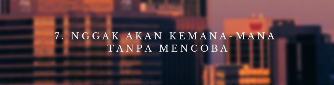 Berada pada satu tempat yang menurutmu nyaman memang bikin betah dan nggak mau pindah. Padahal hidup ini selalu dinamis. Bukan memaksa diri untuk selalu ikut arus dan tren yang ada. Tapi, lebih ke persoalan perkembangan diri. Karena, nggak ada kesuksesan yang bisa didapatkan dalam waktu yang singkat. Oleh sebab itu, jangan ragu buat mencoba sesuatu yang lebih menantang. Karena kamu pasti dapat pengalaman dan petualangan baru. Jangan malas juga untuk kerja cerdas.