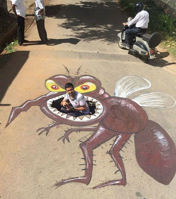Pasti sering banget kan kita gemas banget kalau lihat jalanan jelek dan pemerintah nggak bergerak cepat untuk memperbaiki jalan? Nah, seorang pelukis asal India bernama Baadal Nanjundaswamy punya cara unik nih untuk mengkritik pemerintah. Setiap jalanan rusak, ia jadikan media melukis. Biasanya Baadal membuat lukisan 3D pada jalan berlubang.