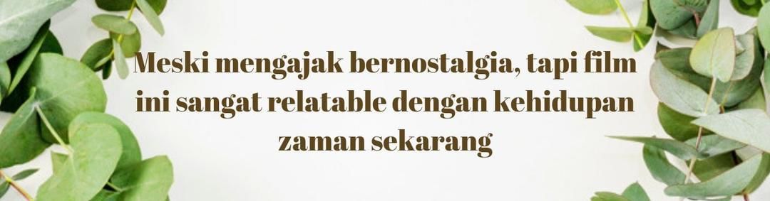 Film ini bisa dikatakan menghadirkan alur di luar ekspektasi penontonnya. Keluarga Cemara yang modern, dengan Abah yang lebih muda. Tapi di film ini juga seolah menjawab bagaimana Abah di sinetron (pada masa tua) bisa sebijak itu. Meski kamu bukan anak 90an yang tidak menikmati sinetronnya, dijamin tidak akan kecewa.