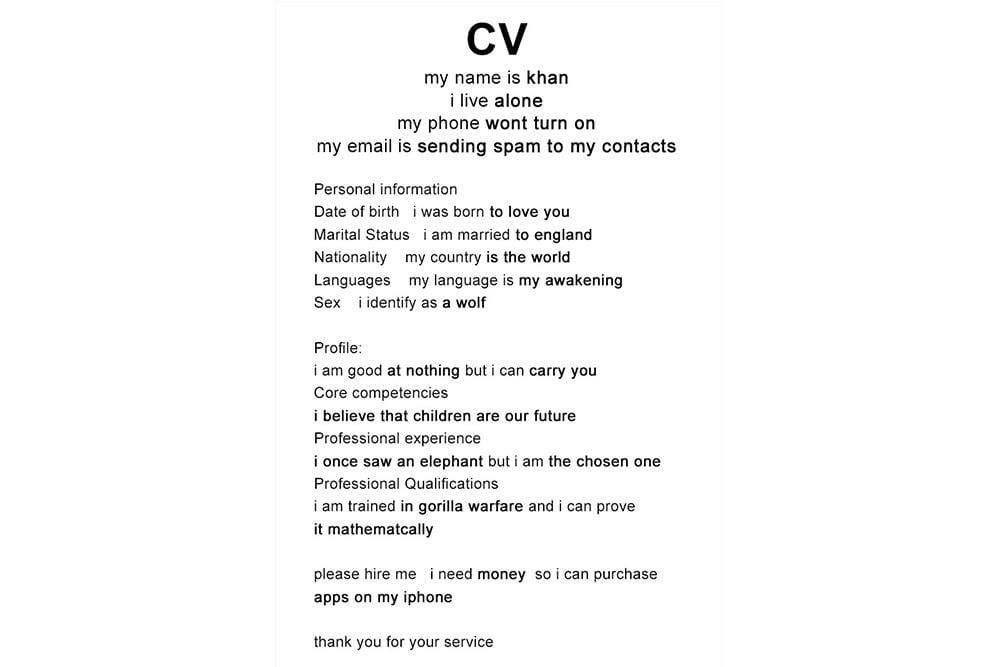 Dengan menggunakan Google Autocomplete, Aaron berhasil memberi tahu calon pimpinannya kalau namanya adalah Khan, bahwa dia tinggal sendirian, dia dilahirkan khusus untuk mencintai pimpinannya, dan teleponnya tidak akan menyala. Bukankah itu informasi yang konyol? Di bagian akhir dia bahkan menuliskan kalimat, "Tolong rekrut saya, saya butuh uang untuk membeli aplikasi di iPhone saya." Alih-alih menerima, mungkin pihak HRD perusahaan yang dituju malah tak akan berhenti tertawa.