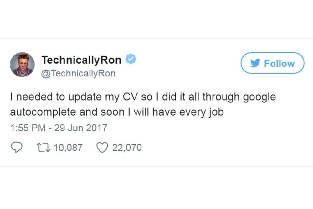Aaron Gillies mengunggah foto CV-nya yang telah selesai ke akun twitter-nya. Dia juga menuliskan, "saya perlu memperbarui CV saya, jadi saya melakukan semuanya melalui google autocomplete." Dengan menggunakan tata letak tradisional, Aaron memastikan untuk memasukkan semua hal, seperti namanya, lokasi dia tinggal, dan tanggal lahirnya. Aaron sendiri ialah seorang penulis yang berbasis di London dan pengelola akun twitter kocak dengan nama TechnicallyRon. Ya, dia memang tidak serius dengan CV barunya.
