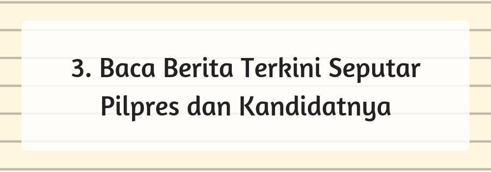 Untuk mengurangi sikap cuek dan bingung terhadap pilpres nanti, ada baiknya kamu update dengan berita-berita tentang pilpres dan para kandidat. Dari berita yang ada, kamu bisa membuat opini pribadi terhadap komunikasi serta sikap tiap kandidat selama masa kampanye.