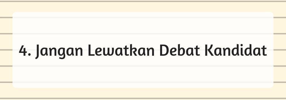 Debat kandidat merupakan acara yang sangat membantu kamu untuk menentukan pilihan. Lewat debat, kandidat unjuk gigi dan melontarkan semua pemikiran-pemikiran mereka tentang segala isu yang dibahas. Jika ingin semakin mengenal para kandidat, tonton debatnya dan dapatkan pencerahan dari sana.