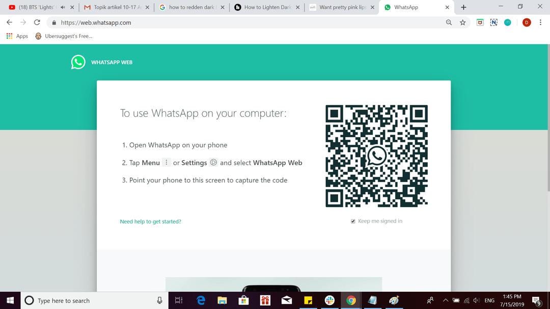 1. Buka browser-mu, dan ketik web.whatsapp.com, lalu tekan 'Enter' pada keyboard. Kamu akan langsung masuk ke menu WhatsApp Web dan menemukan barcode yang siap di-scan.