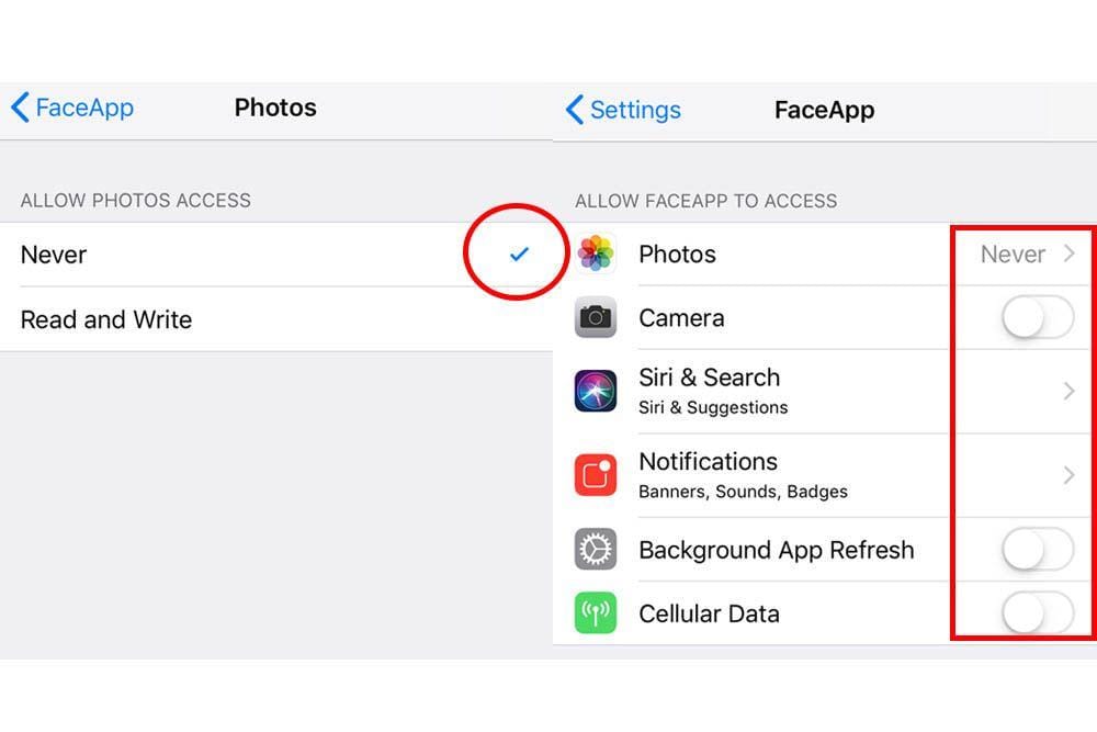 Tapi kalau kamu concern banget dengan privacy, selain uninstall FaceApp, kamu juga bisa menghindari si aplikasi membaca lokasimu berada. Caranya, ubah pengaturan pada iPhone atau Android milikmu, jika menggunakan iPhone, klik Setting > Slide ke bawah klik aplikasi FaceApp > lalu matikan tombol hijau Camera dan klik “Never” supaya FaceApp tidak bisa mengakses galeri fotomu, contohnya seperti di atas.