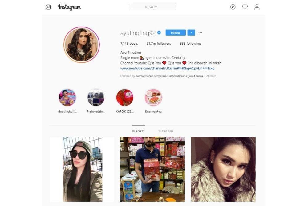 Posisi pertama akun followers Instagram terbanyak di Indonesia masih diduduki oleh penyanyi dangdut Ayu Ting Ting. Saat ini Ayu memiliki jumlah followers sebanyak 31,7 juta. Karena banyaknya jumlah followers tersebut, Ayu memanfaatkannya untuk mengembangkan bisnisnya, seperti bisnis kuliner, fashion dan produk kecantikan.
