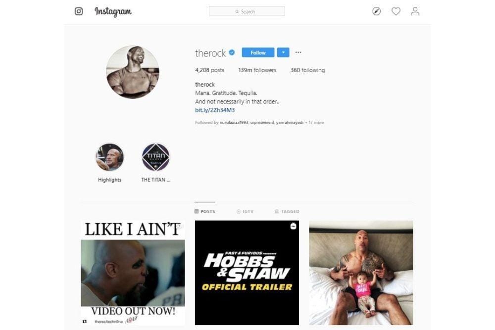 Selanjutnya, akun followers Instagram terbanyak di dunia ditempati oleh Dwayne Johnson alias The Rock dengan jumlah followers mencapai 139,4 juta. The Rock berhasil menjadi sangat populer beberapa tahun belakangan ini lantaran semakin aktif membintangi banyak film.