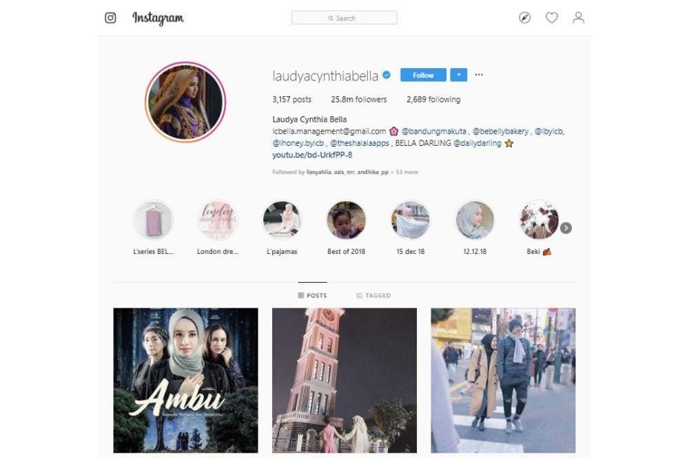 Di posisi kelima sebagai akun followers Instagram terbanyak di Indonesia ada Laudya Chintya Bella dengan jumlah 25,8 juta. Pada akun tersebut, Bella lebih sering mengunggah foto kesehariannya bekerja, hingga saat quality time bersama dengan suami dan anaknya. Namun, tak lupa, Bella juga mengunggah foto promosi bisnis yang tengah ditekuninya.