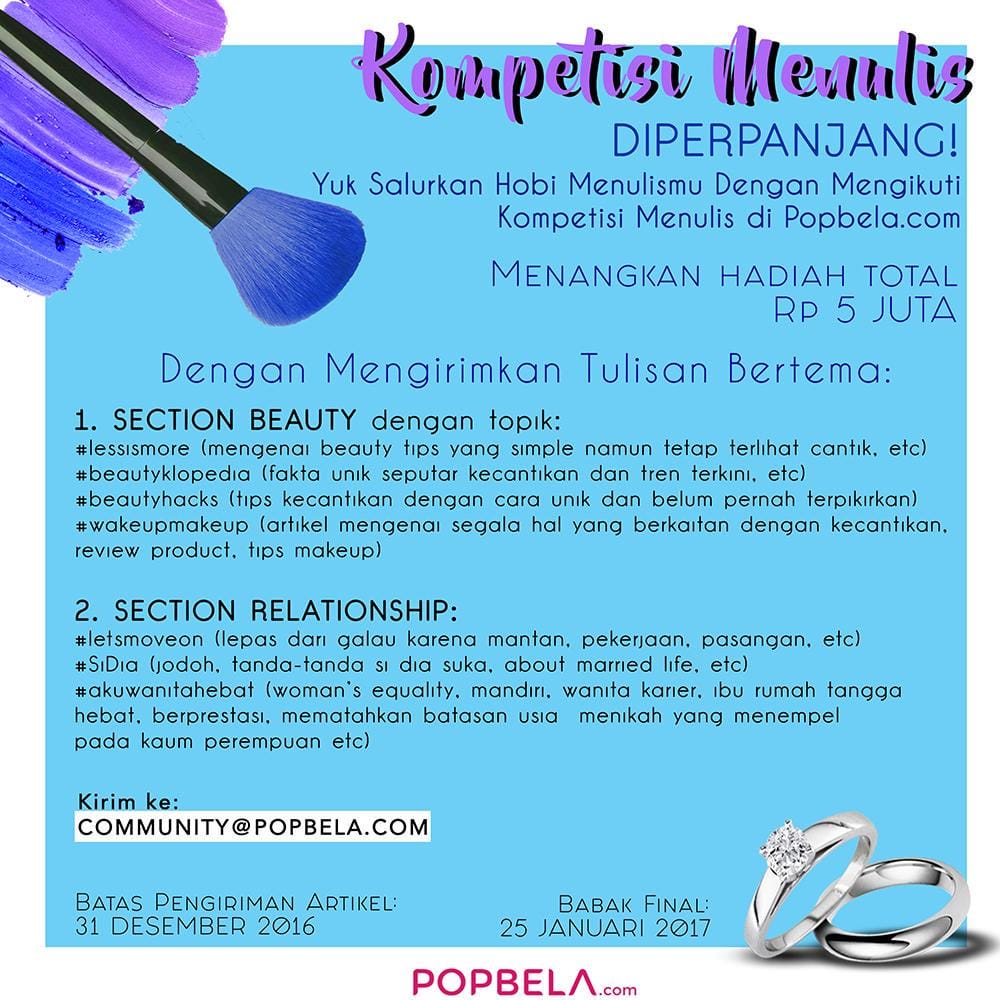 Jika sebelumnya Popbela mengumumkan pengiriman artikel berakhir pada tanggal 30 November 2016, ada kabar baik buat kamu. Popbela akhirnya memutuskan untuk memperpanjang lomba menulis artikel Relationship dan Beauty. Yuk berbagi tips serta informasi kecantikan dan pengalaman kisah cintamu dengan mengirimkan artikel ke Popbela.com sebelum tanggal 31 Desember ya. Selain karya tulismu bisa diterbitkan di website POPBELA.com dan IDNtimes.com, kamu juga punya kesempatan untuk memenangkan hadiah uang tunai total Rp 5 juta, dengan rincian