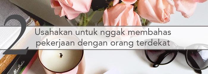 Setelah jam kerja sangat disarankan untuk menggunakan waktu untuk mengistirahatkan tubuh dan merelaksasi pikiran agar beban kerja dan stres mereda. Membuka email usai jam kerja bisa semakin meningkatkan stres. Langkah sederhana yang bisa kamu lakukan setelah jam kerja usai adalah lakukan me time semaksimal mungkin baik itu di rumah, café, restoran, bahkan di pusat perbelanjaan. Dan yang paling penting nonaktifkan notifikasi email pekerjaan setelah kamu keluar dari kantor.