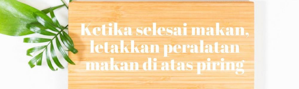 Jika kamu sudah selesai makan, berikan signal dengan menyusun peralatan makan seperti garpu dan pisau diatas piring dengan keadaan terbalik. Jika kamu tidak mampu menghabiskan makanan kamu, jangan meminta untuk membungkus makanan kamu kepada pelayan.