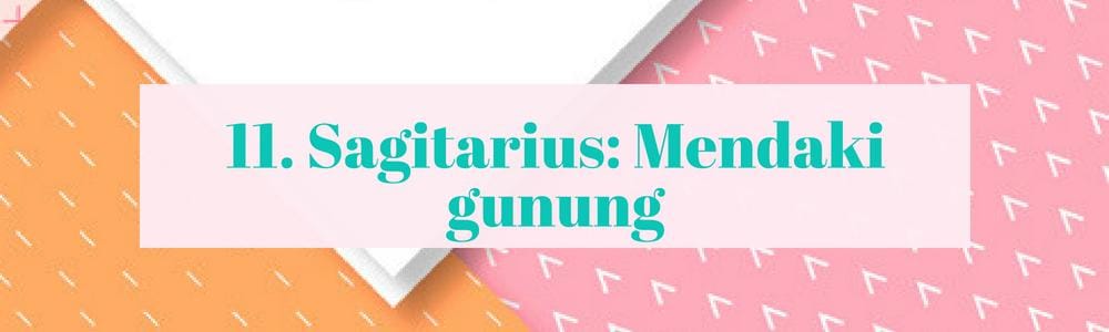Untuk Sagittarius, nggak ada yang lebih baik selain mendaki gunung. Sebab kamu adalah pribadi yang ekstrovert, meluangkan waktu sendiri di tengah-tengah alam mungkin akan terasa sepi pada awalnya. Namun, pikiranmu yang terbuka serta antusiasmu akan memudahkanmu melakukannya. Selain itu, ini adalah kesempatan terbaik untuk membebaskan pikiranmu membayangkan berbagai hal.