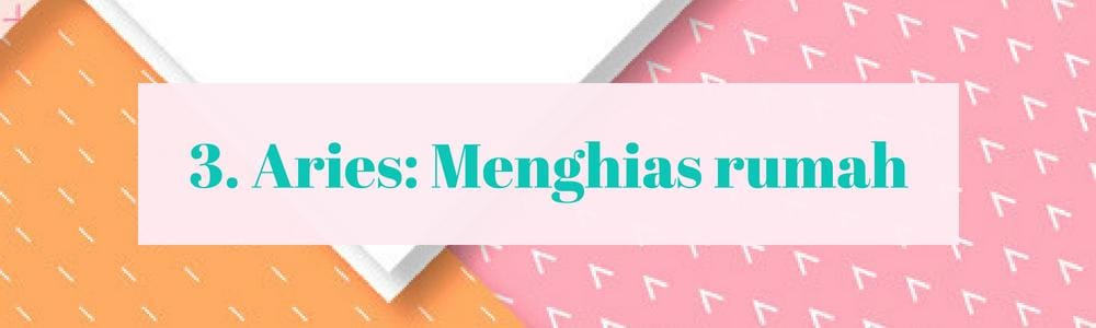 Saat sendiri, kamu yang memiliki zodiak Aries dapat menenggelamkan pikiranmu untuk menghiasi rumah. Mengganti wallpaper kamar atau menata ulang perabotan di rumah adalah medium terbaik untuk mengeluarkan kreativitasmu. Ditambah karena sikap cukup spontan, kemungkinan besar kamu akan melakukan makeover kecil untuk rumahmu sehingga semua terlihat memuaskan.