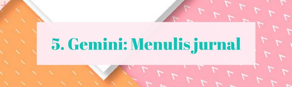 Sendiri adalah waktu terbaik untuk menuliskan isi pikiran pada sebuah jurnal bagi para pemilik zodiak Gemini. Sebab kamu orang yang cukup ekspresif dan memiliki kecerdasan yang cepat, menulis jurnal dapat menjadi kegiatan yang restoratif untuk otak sekaligus menyenangkan. Kegiatan ini juga baik sebagai bentuk refleksi diri.