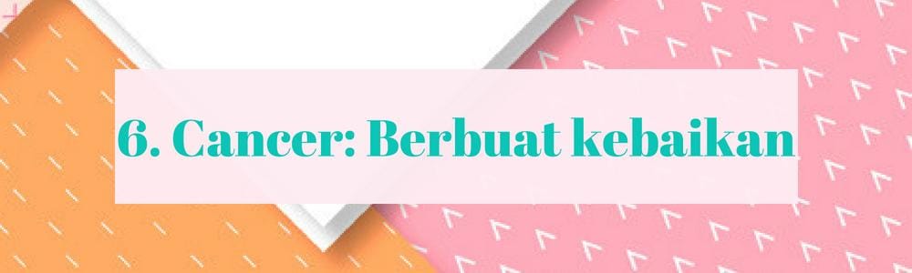 Pemilik zodiak Cancer adalah orang-orang yang senang melakukan kebaikan, sekecil apapun perbuatan itu. Entah itu membantu orang lain menyebrang jalan yang ramai, membawakan kantong belanja ibu-ibu yang kesusahan, entah menepuk pundak seseorang karena resleting tasnya yang terbuka. Intuisi dan sensitivitas membuatmu senang melakukan kebaikan. Jadi, salah satu kegiatan seru yang bisa kamu lakukan ketika sendiri adalah berbuat baik.