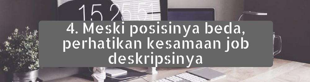 Misalnya begini, kamu melamar untuk posisi Telemarketing dan Customer Service. Kalau memang itu yang kamu lamar, mungkin perusahaan masih bisa memahami dan menerima, sebab ada kemiripan pada job desk-nya. Tapi ketika misalnya kamu melamar untuk posisi Social Media Specialist dan Akuntan, kamu akan dianggap orang tidak fokus, tidak konsisten dan yang paling buruk ialah putus asa. Kamu tak bisa melahap semuanya, tetapkan tujuan kariermu dan lamarlah pada bidang di mana kamu paling merasa kompeten.
