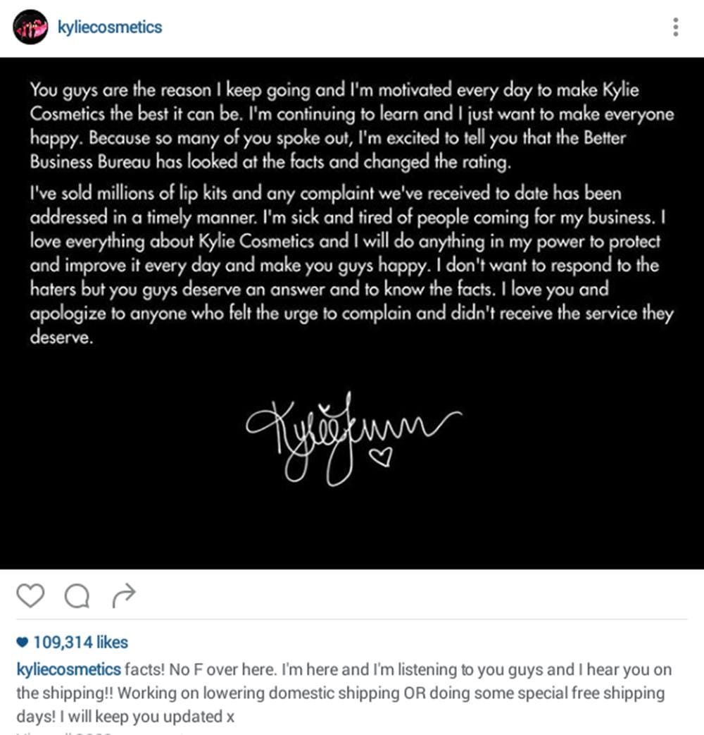 Merasa geram atas rating tersebut, Kylie memberikan pertanyaan melalui Instagram bahwa BBB nggak memberikan rating F, melainkan belum memberikan rating atau no rating. “Karena banyak dari kalian yang membicarakan hal ini, aku ingin mengatakan bahwa Better Business Bureau telah melihat faktanya dan mengubah penilaian mereka," tulisnya. Kylie juga meminta maaf kepada para pelanggan yang merasa dirugikan atas kejadian ini.