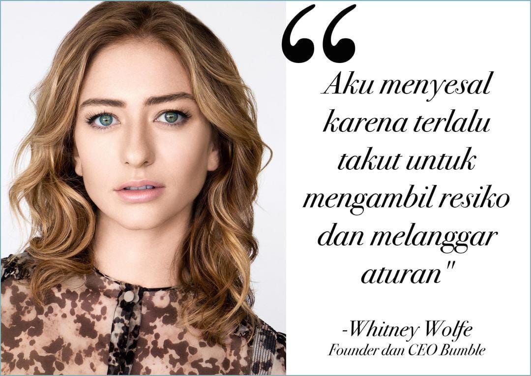 Bumble adalah aplikasi dating yang diperuntukan untuk kaum feminis sebagai sebuah langkah perubahan pertama mereka. Tidak heran jika Whitney berhasil membawa kesuksesan untuk aplikasi ini karena dia pulalah yang berasa di belakang kesuksesan marketing aplikasi Tinder. Sebenarnya dia ingin mencoba berbagai ide marketing yang lebih menyenangkan dan kreatif, tapi ia terlalu takut dan memilih jalan aman. Kini Whitney cukup menyesalinya, baginya melanggar aturan bukanlah suatu masalah asalkan tidak melanggar hukum.