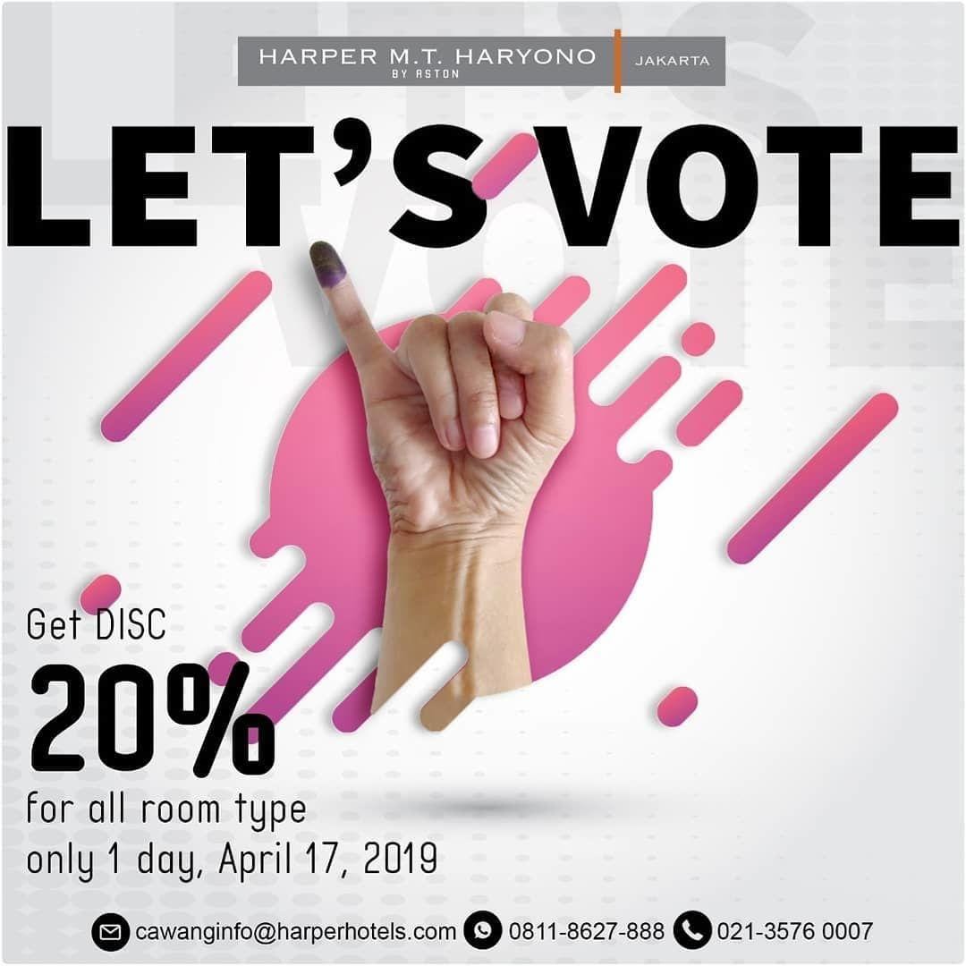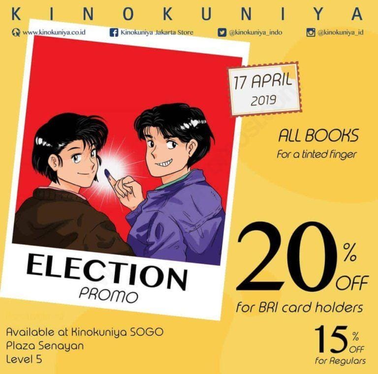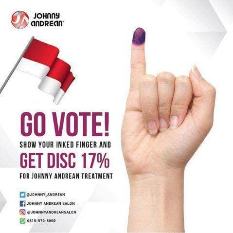 Pada pemilihan umum besok (17/4), banyak tenant makanan yang memberikan diskon jika kita dapat memperlihatkan jari tercelup tinta sebagai bukti bahwa kita sudah mengikuti pemilu 2019. Ternyata tidak hanya tenant makanan dan minuman yang memberikan diskon lho. Beberapa tenant lain seperti salon, toko buku, hotel, bahkan taman bermain juga memberikan diskon yang lumayan saat kita bisa menunjukkan jari bertinta ungu.