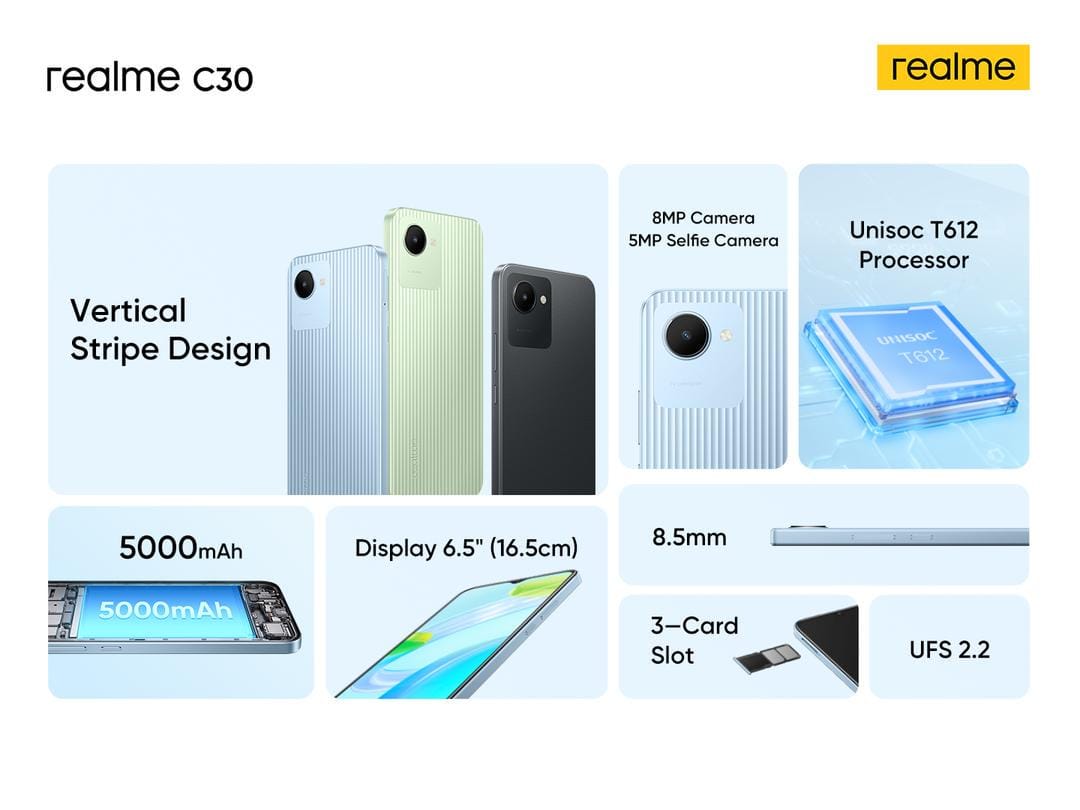 realme C30 membawa prosesor Unisoc T612 yang kuat, menjadikannya terbaik di segmennya, mencetak skor 224.233 pada benchmark AnTuTu. Prosesornya memiliki arsitektur octa-core 12nm yang memiliki clock speed hingga 1,82 GHz dan mengadopsi struktur Cortex A75 untuk performa dan Cortex A55 untuk efisiensi, menghadirkan kinerja yang kuat dan stabil untuk realme C30. Selain delapan inti CPU, SoC ini mengandung beberapa komponen. Di antaranya adalah GPU Mali-G57, ISP tiga inti, dan tentu modem 4G.