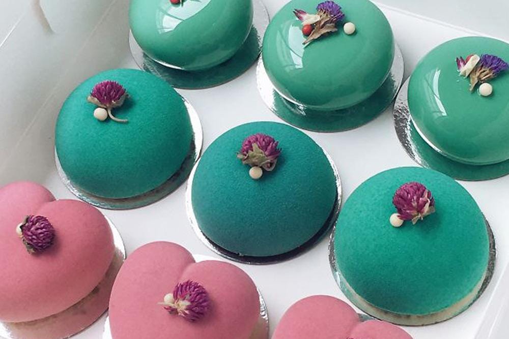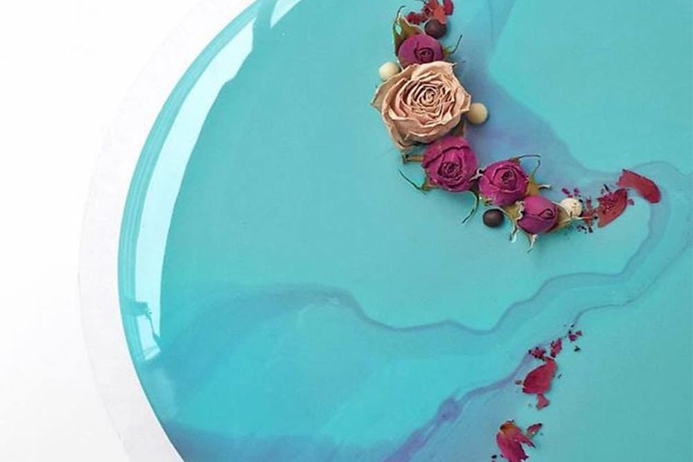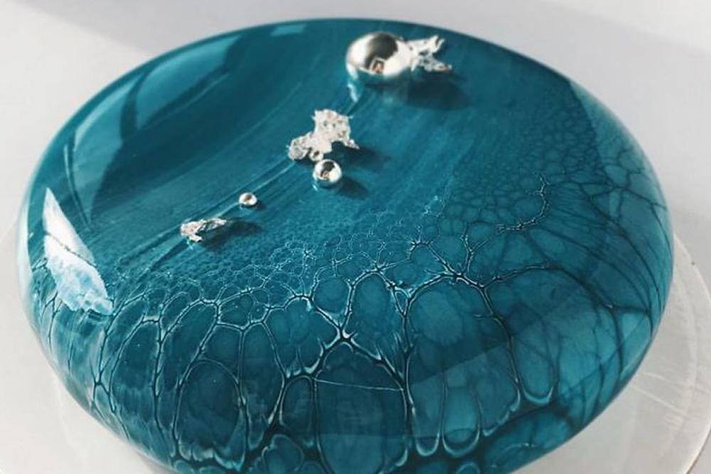 Mousse cake dengan warna turquoise, serta dibentuk marble. Unik dan sayang ya jika dimakan.