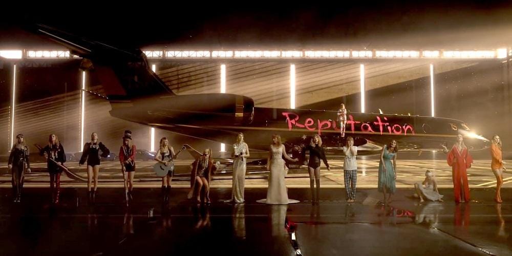 Sekumpulan Tay berbaris di depan pesawat bertuliskan ‘Reputation’. Masing-masingnya mengenakan pakaian pada video Tay sebelumnya.