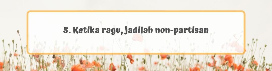 Akan sangat sulit untuk menahan opini pribadi, apalagi ketika sedang ditanya oleh rekan kerja. Namun kadang, ada baiknya untuk bersikap seolah nggak memberi dukungan pada siapapun. Kamu bisa mengatakan pernyataan seperti, "Nggak peduli siapa yang menang, kuharap Indonesia bisa menjadi lebih baik lagi ke depannya." Dengan begitu, kamu bisa lolos dari diskusi politik dan kembali pada pekerjaan yang perlu diselesaikan. Komentar ini nggak terlihat pasif atau lemah, Bela. Malah, ini jadi cara terbaik untuk mengurangi tekanan dan meningkatkan kemampuanmu untuk mengalihkan pembicaraan. After all, tujuan dari sistem politik adalah untuk membuat negaranya berjaya—kita hanya terbagi untuk mewujudkan tujuan itu dengan cara yang terbaik.