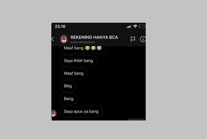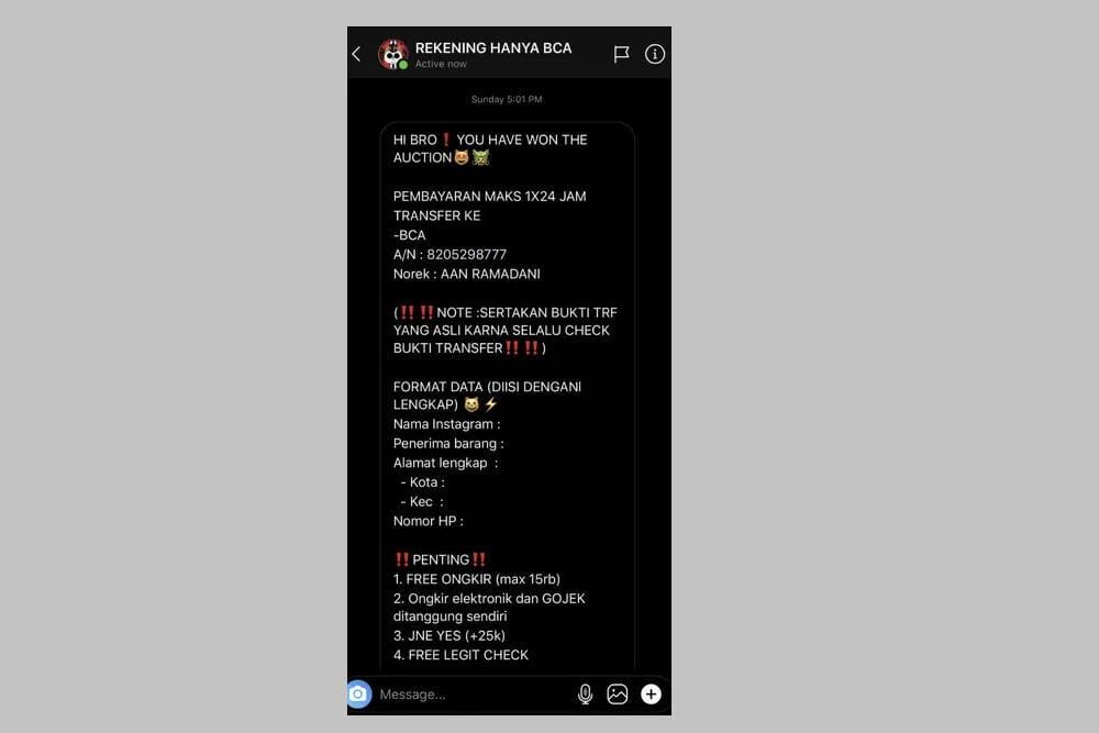 1. Dalam foto tangkapan layar, terlihat si pelaku mengirimkan pesan bahwa Kaesang telah memenangkan lelang. Ia juga mengirimkan format pengiriman dan nomor rekening atas nama Aan Ramadani.
